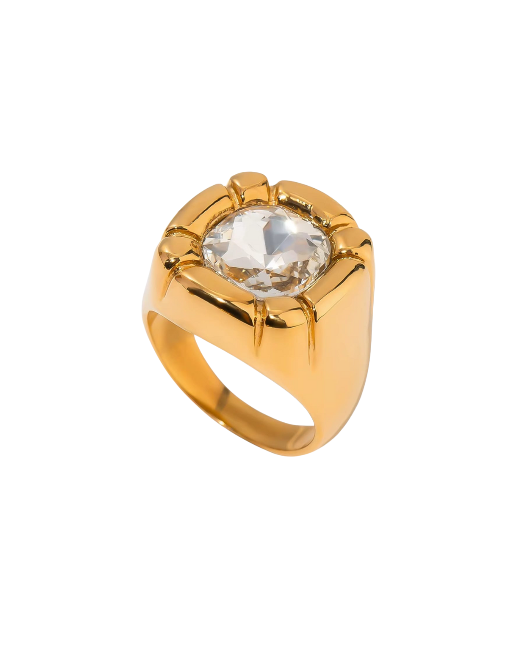 xThis radiant gold-plated ring features a bold, gem-like centerpiece and a soft crown-inspired silhouette. Made from high-quality stainless steel and finished with 18k gold plating.