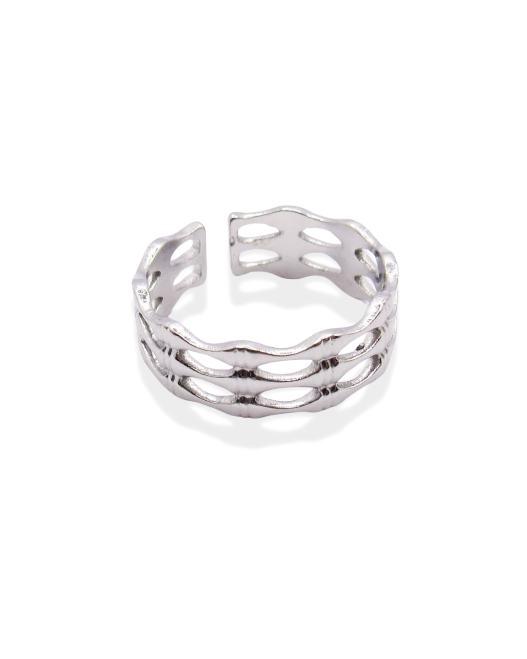 xThis bamboo-style ring is crafted from high-quality stainless steel with 18k gold plating, available in both silver and gold finishes. The layered, open band design is fully adjustable — a lightweight, durable piece made to grow with you.