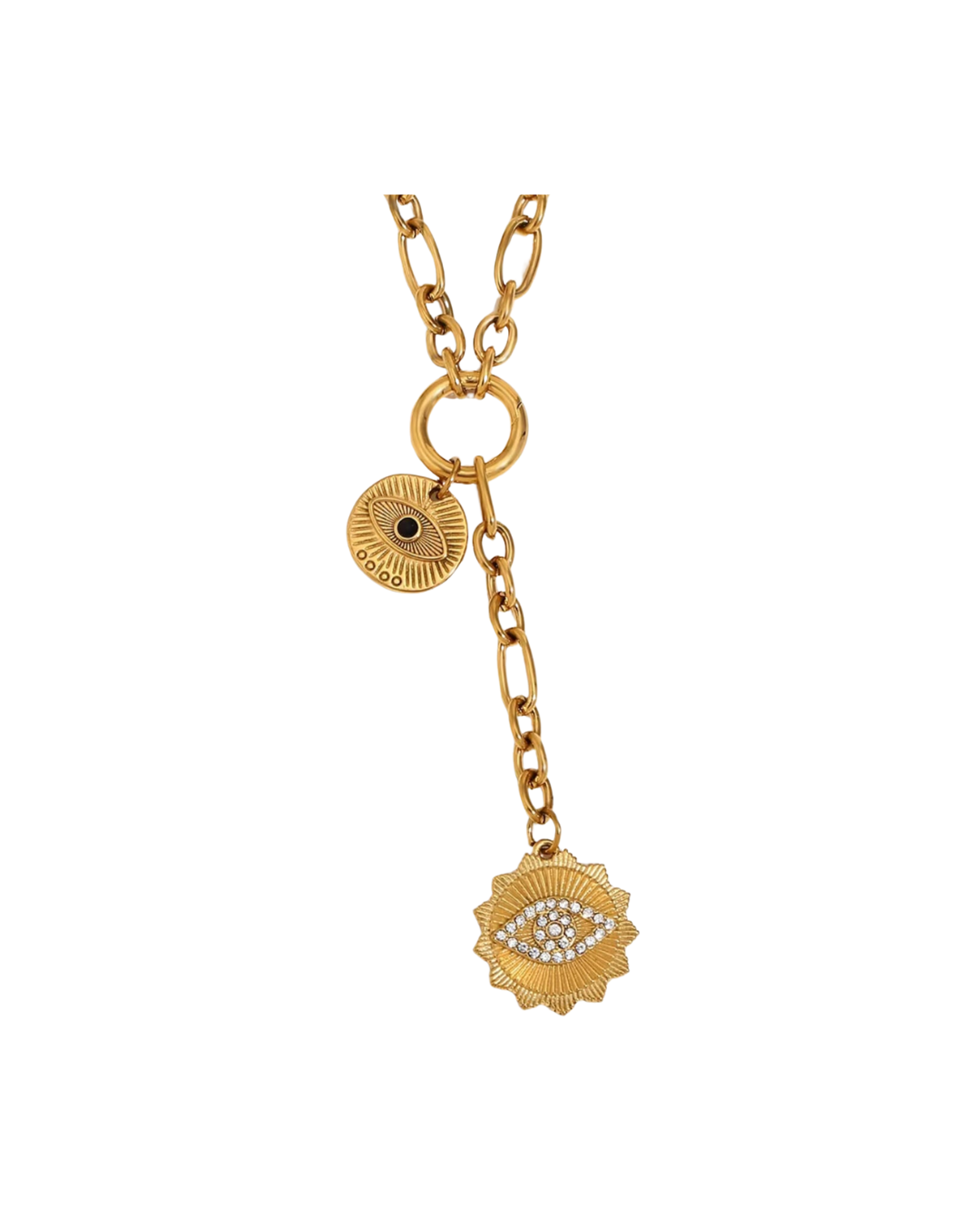 xA bold gold evil eye pendant on a mid-weight chain, made with hypoallergenic, water/sweat-resistant, 316L stainless steel.