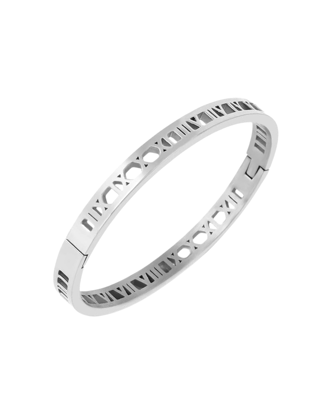 xThis engraved stainless steel bracelet features bold Roman numerals and a smooth finish that layers beautifully.