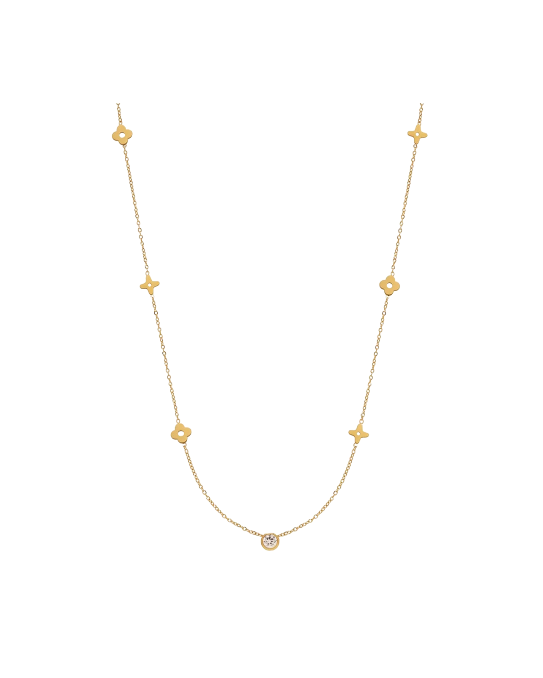 xCrafted in durable 316L stainless steel with 18k gold plating, this lightweight necklace features delicate floral-inspired accents along the chain and a single center stone.